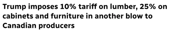 與此同時,他還宣布,對進口木材徵收10%關稅,並對廚櫃、浴室盥洗台和軟墊家具徵收25%關稅,此舉將對加拿大木材企業造成嚴重打擊!