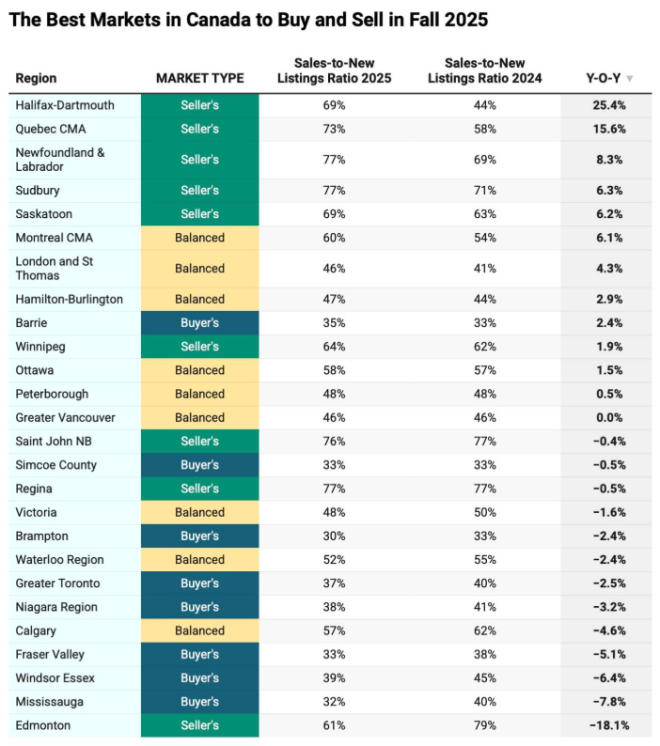 该房产中介分析了哪些市场对买家最有利。分析依据的是加拿大各地房产局2025年8月的数据,主要看的是“新挂牌房源销售比”(sales-to-new listing ratio)。