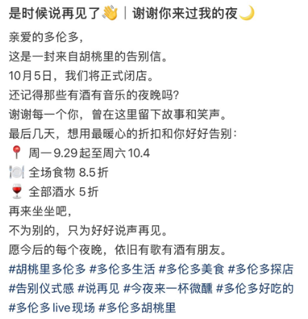 “是时候说再见了。”这是胡桃里发在社交媒体上的告别信。简短却满是情绪:“还记得那些有酒有音乐的夜晚吗?谢谢每一个你,曾在这里留下故事和笑声。”