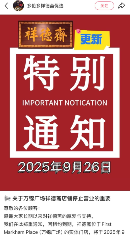 祥德斋(FMP):因租约到期,祥德斋位于万锦广场的实体门店,将于2025年9月25日起正式停止营业。同时,该门店将不再使用“祥德斋”牌匾。不再售卖祥德斋的糕点。