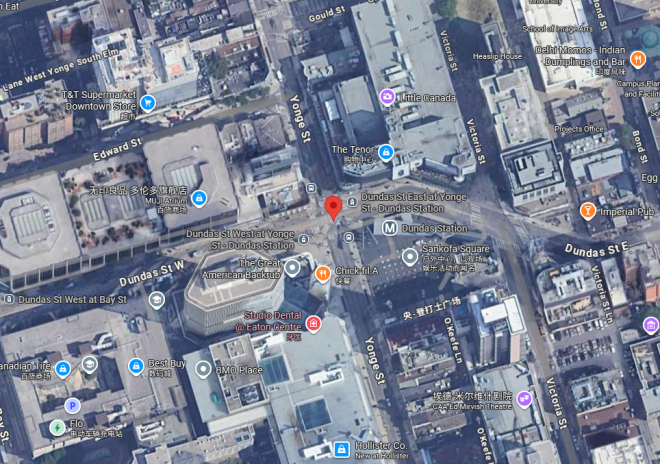 警方调查人员表示,事件发生在周三上午9:30左右,地点位于登打士西街(Dundas Street West)和央街(Yonge Street)交汇处。这是该市最繁忙的十字路口之一,附近有Sankofa Square,Eaton Centre和Dundas地铁站。