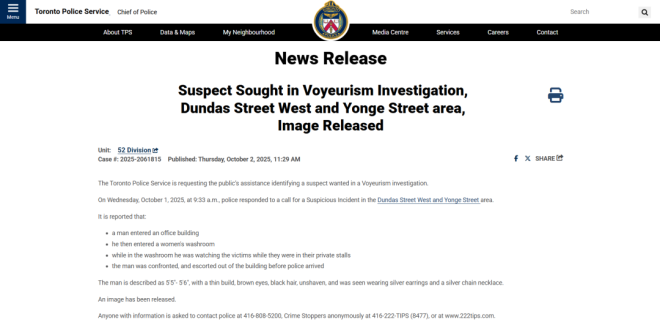 10月2日,多伦多警方发布通告,正在寻求公众帮助,以确认一名男子的身份。该男子被指控涉嫌偷窥,据称他曾躲在市中心一栋办公大楼的女卫生间内偷窥女性。