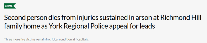 约克区警方表示,这起致命火灾是一起纵火案,目前正在由安大略省消防局进行调查。到目前为止,还没有人被逮捕。