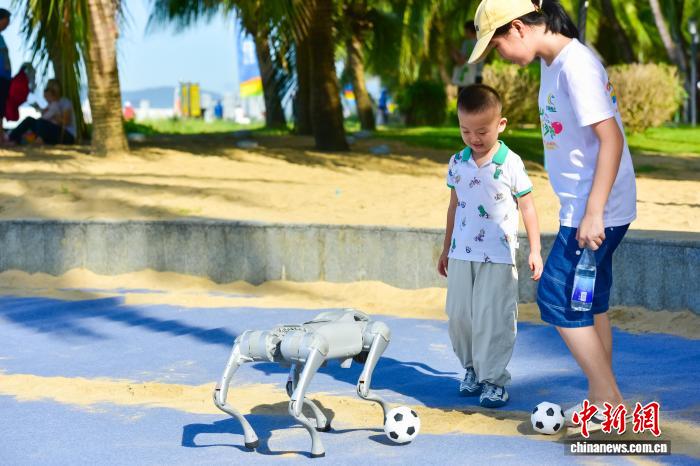 10月4日,第六届亚洲沙滩运动会开幕倒计时200天系列活动在三亚启动。图为民众与人工智能机器狗进行沙滩足球项目互动。(第六届亚洲沙滩运动会执委会 供图)
