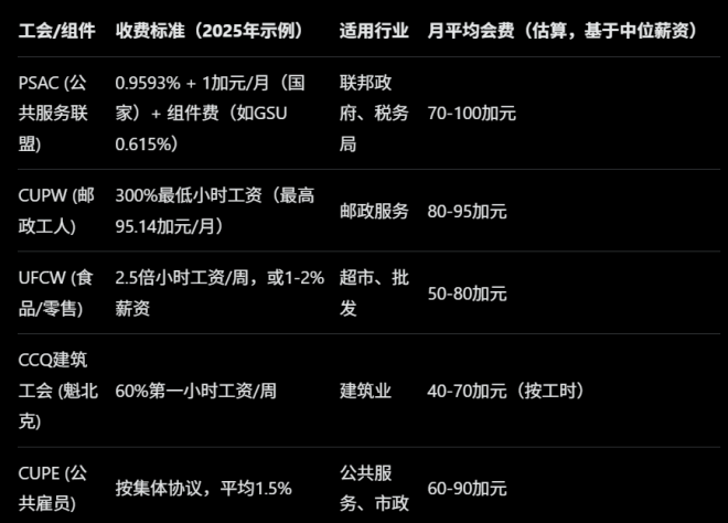 例如公共服务联盟加拿大(PSAC)会费为0.9593% + 每月1加元固定费(2022年起),农业工会AGR从2025年1月1日起调整为0.7069%。