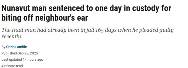 据Vancouver Sun报道,努纳武特地区一名男子因邻里纠纷咬掉了邻居大半只右耳,但最终法官只判处他一天监禁。
