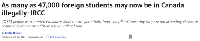近日,加拿大移民部(IRCC)在国会曝出一个惊人数字:超过47,000名留学生可能违反签证条款,目前处于非法滞留状态。