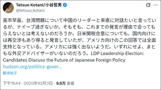 小谷哲男在社交平台發布的帖文 社交平台“X”