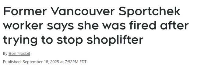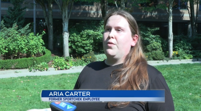 据CTV News报道,市中心Robson街的一家Sportchek门店,一名前员工Aria Carter站出来控诉,她因为试图阻止一起盗窃行为而被公司解雇。