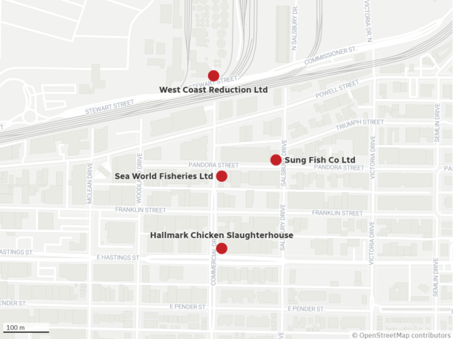 在这些投诉中,West Coast Reduction Ltd.被点名最多,就它一家就占了357起投诉。这地方是全省唯一一家专门处理食物废料和动物副产品的工厂,平时收的都是肉骨头、鱼虾壳子、鸡鸭下脚料……然后再统统“回炉重造”。