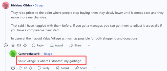 甚至有网友吐槽说:“Value Village的定价‘水太深’,我尽量不会去购物或捐东西”,“Value Village是我捐垃圾的地方”。