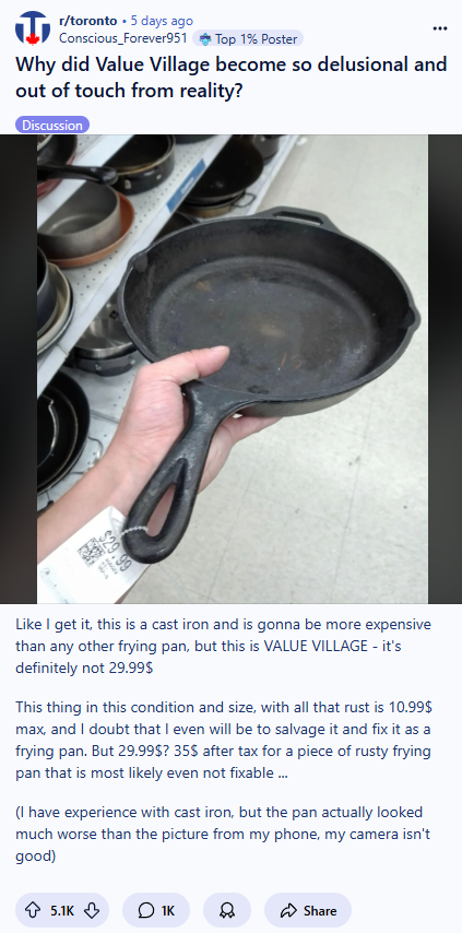 最近,一张在旧货连锁店Value Village拍到的照片在网上引发热议:一口生锈的铸铁锅竟然标价29.99加元,引来上百条评论,大家都在抱怨“旧货店也太贵了”。