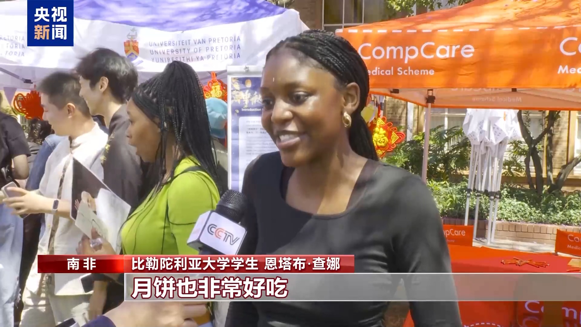 南非比勒陀利亚大学学生 恩塔布·查娜:中秋节让我觉得很温馨,这是我第一次看到中国人穿汉服。我品尝了中国茶,一切都很棒,月饼也非常好吃。