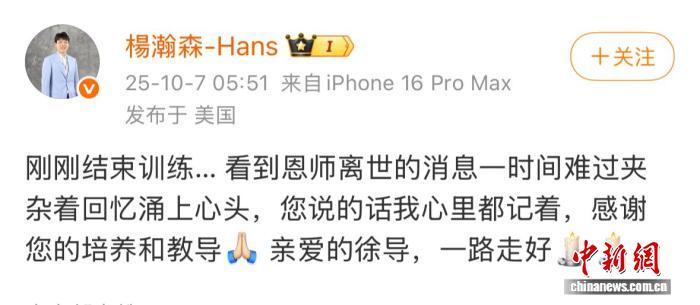 10月7日,美职篮(NBA)开拓者队球员杨瀚森发文悼念恩师。