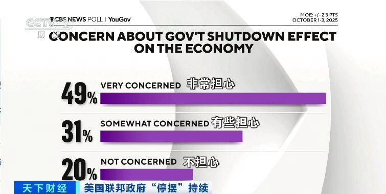 美国哥伦比亚广播公司5日公布的一项最新民意调查显示,对美国政府“停摆”的担忧已经跨越了党派界限,其中政府“停摆”对经济的影响让美国人感到不安,49%的受访者表示非常担心,31%的人有些担心,只有20%的人表示不担心。牛津经济研究院首席美国经济学家瑞安·斯威特估计,“停摆”每多持续一周,就可能导致美国四季度年化经济增长率多下降0.1至0.2个百分点。