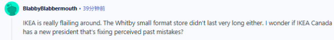 “宜家真是举步维艰。Whitby的小型门店也没撑多久。不知道宜家加拿大有没有换个新总裁来纠正过去犯下的错误?”