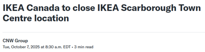 宜家加拿大(IKEA Canada)刚刚宣布:由于零售环境剧变、消费者购物方式改变,STC门店将于2026年初正式关闭。在最终关店日期确定前,门店仍会照常营业。