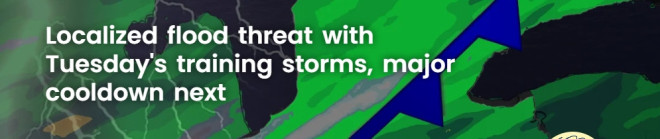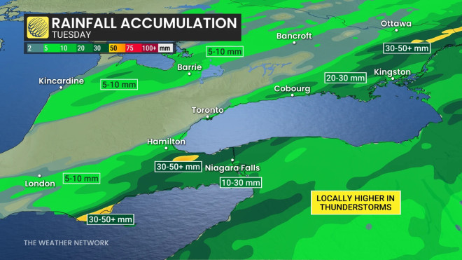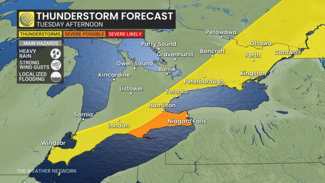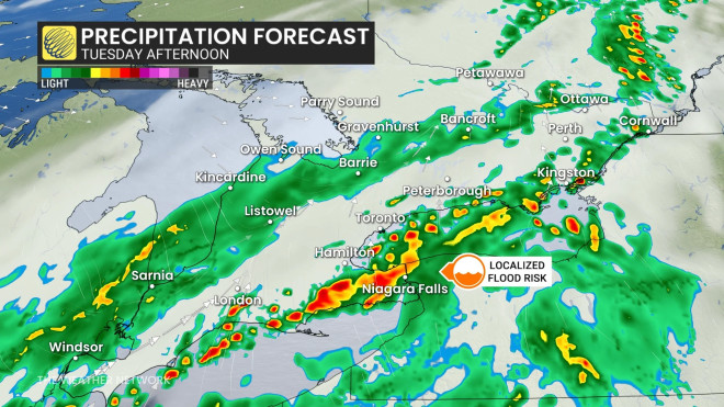 在尼亚加拉半岛形成的雷暴系统风险最高,可能带来强降雨与局部洪水。截至周二中午,St. Catharines及伊利湖北岸地区的降雨量已达50毫米。