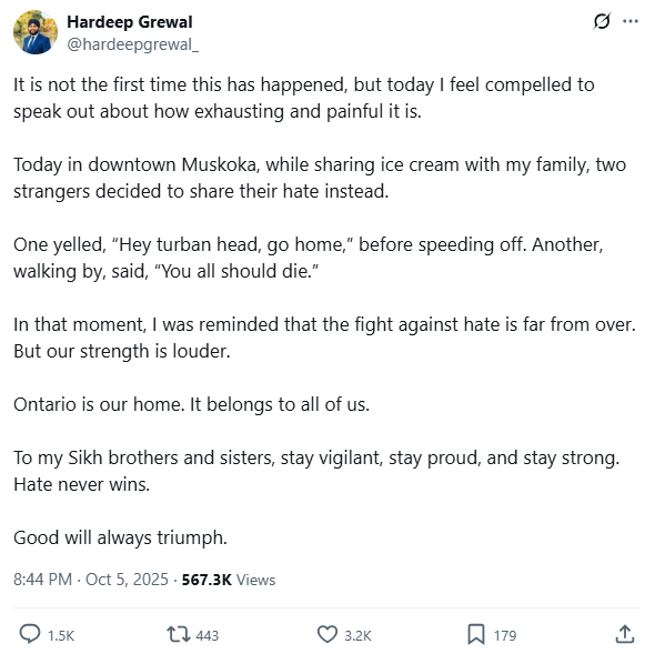 “这已经不是第一次遇到这种事了,”哈迪普·格雷瓦尔(Hardeep Grewal)在上周日晚间(10月5日)的一篇社交媒体帖文中写道,“但今天,我必须站出来说——这种经历真的让人身心俱疲、痛苦不堪。”