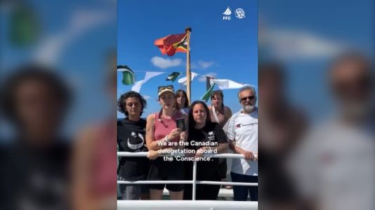 「我們是良心號上的六名加拿大公民,如果閣下看到這段視頻,那我們就是被以色列軍隊或其他參與對巴勒斯坦人民進行種族滅絕國家的軍隊在海上襲擊和綁架,」一名女子十月八日週三在Global Sumud Flotilla的X社媒帳戶上分享一段視頻。