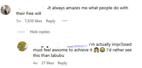 “其实我挺佩服他们的!能完成这种挑战一定超有成就感……我宁愿看这种,也不想再看到那些Labubu(小怪兽玩偶)了!”