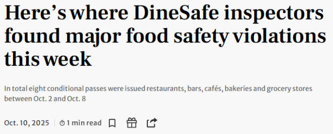 10月2日至10月8日期间,多伦多公共局向8家餐厅、超市发出了“有条件通过”(conditional pass)的评等通知。这意味着在这些场所的检查中发现了至少一项对公众健康构成重大风险的违规行为。