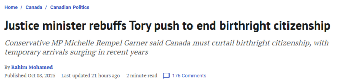 这次掀起风波的,是保守党议员Michelle Rempel Garner。她在议会里提出修法,要求孩子必须有至少一名加拿大籍或永久居民父母,才能自动成为公民。