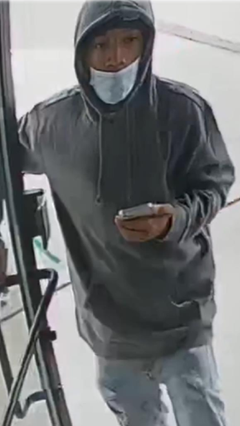 嫌疑人1: 男性,黑人,身穿灰色连帽衫,浅色破洞牛仔裤,黑色鞋子,戴着医用口罩。