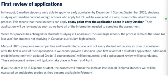 近期,UBC在其官网上发布了新申请季的录取规则,新增针对本土高中生申请的“首次审查机制(First Review of Applications)”。