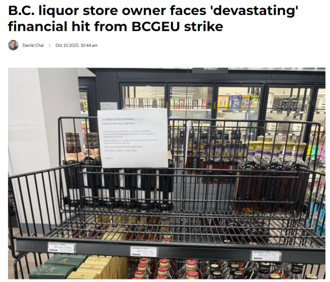 在大温地区,一位小型酒类零售商表示,由于 卑诗省政府雇员工会(BCGEU) 的持续罢工,他的生意几乎陷入瘫痪,损失“极其严重”。