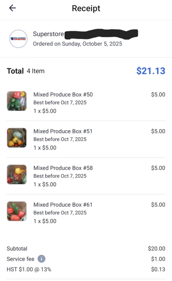 SkeletonBump 分享了他在 10 月 5 日星期日从 Superstore 购买食品杂货的收据截图。