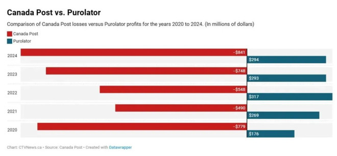 根据财报,2024年前三季度,加拿大邮政亏了8.41亿加元,而Purolator净赚2.94亿。工会气得直跳脚:“我们在街上举标语讨公道,他们在办公室里笑着数钞票!”