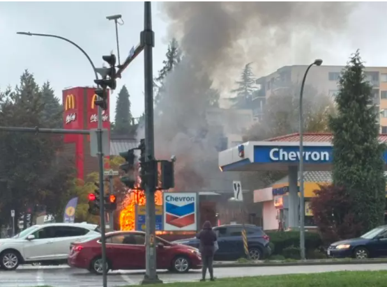 卑诗省新西敏麦克布莱德大道(McBride Boulevard)靠近第八大道的一家加油站附近,周六(11日)下午发生,现场可见强烈火焰和烟雾。