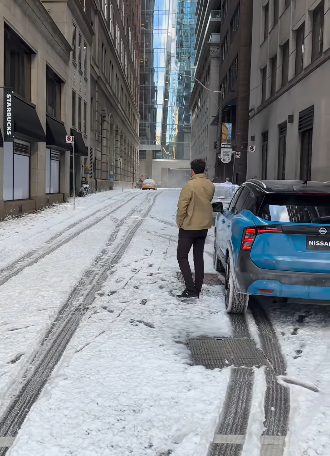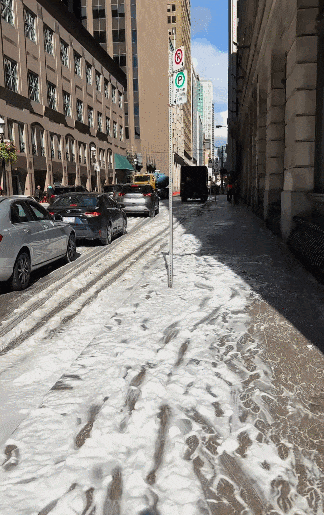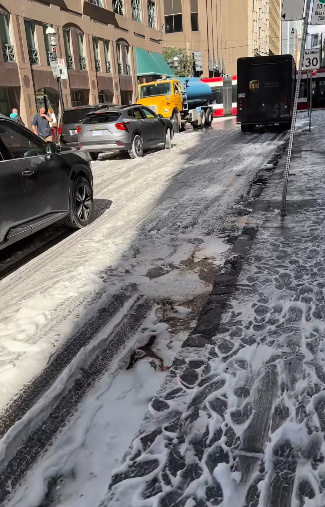 不少网友在社交平台上晒出视频和照片,画面中,King与Victoria交叉口、Bay与Temperance一带的街道地面铺满厚厚“积雪”。