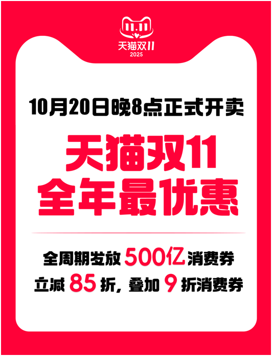 立减85折叠加9折消费券,全周期发放500亿,全年最优惠的天猫双11,将于10月20日晚8点正式现货开卖。