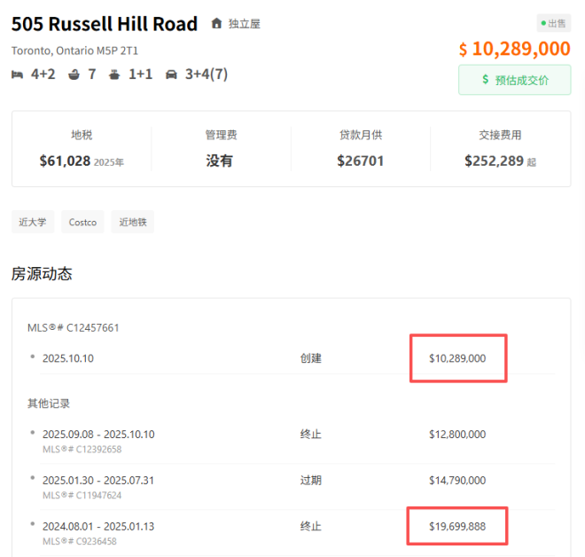 这栋位于多伦多顶级富豪区Forest Hill,就算是在这儿,也不是所有豪宅都能轻松找到买家,505 Russell Hill Rd. 就是个很好的例子。