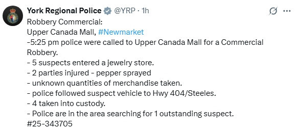 约克区警方表示,周三下午Newmarket一家购物中心的珠宝店遭抢劫后,嫌疑人驾车逃逸,并在404高速公路上发生,目前已有4人被捕。
