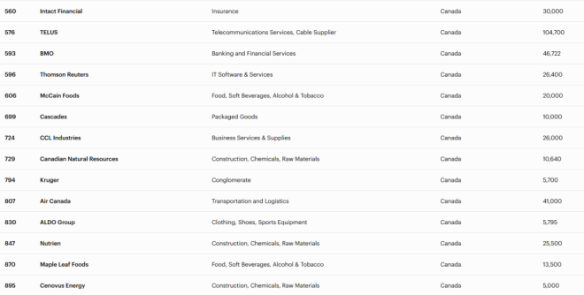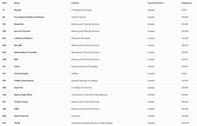 今年共有900家符合条件的企业入榜,这些公司需在全球开展业务并拥有至少1,000名员工。其中包括29家加拿大企业。