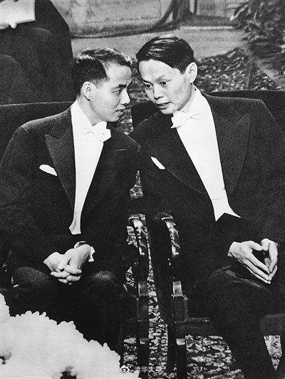 1957年瑞典斯德哥尔摩,诺贝尔物理学奖获得者杨振宁和李政道。来源:清华大学官方微博