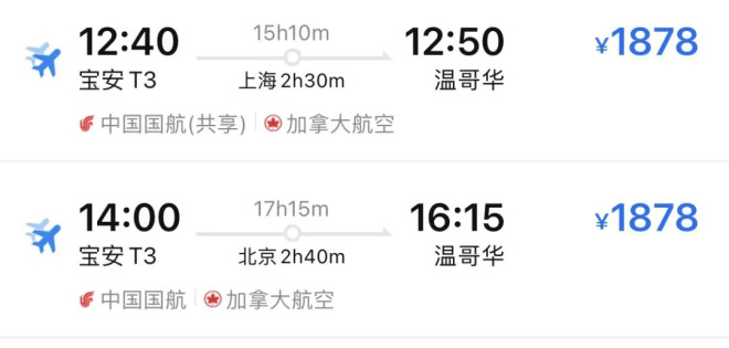 11月4日从西安飞温哥华,经济舱单程票价只要¥1878起;选择搭乘国航,留学生优惠价¥2050: