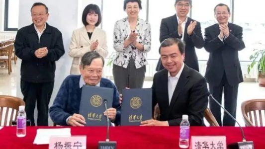 圖:2021年5月14日,楊振寧與清華大學簽署捐贈協議。(新華網)