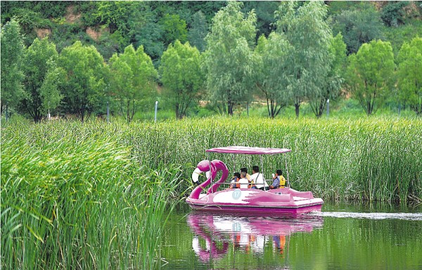 游客在南泥湾国家湿地公园内游玩。