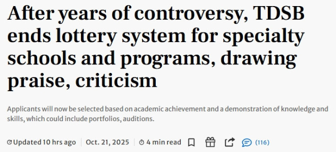 消息一经公布,立即在多伦多家长群中引发热议,许多家长形容这是“振奋人心的消息”,标志着TDSB在多年的争议后,终于回归“凭实力说话”的录取标准。