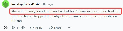Reddit上也有网友自称是被枪杀女子的家人,称Deschepper朝Kulla开了6枪,然后带着女童开车逃离,再将女童交给Fort Erie的家人。
