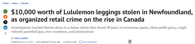 最近纽芬兰(Newfoundland)发生的一起Lululemon盗窃案,让警方在一户人家里搜出了价值$10,000加元的赃物瑜伽裤。警方警告说,这只是一个大趋势的一部分——有组织的零售犯罪在全国范围内正在不断增加。