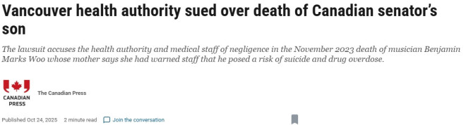 加拿大温哥华海岸卫生局(Vancouver Coastal Health)正面临一宗过失致死诉讼。涉及加拿大参议员之子在精神病房失踪四天后,被发现身亡的悲剧。
