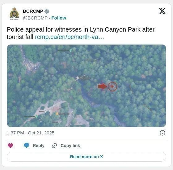 据称,一群游客在位于BC省北温市公园路3663号的林恩峡谷公园(Lynn Canyon Park)接受导游带领时,一名游客从30米高的林恩溪(Lynn Creek)坠落。