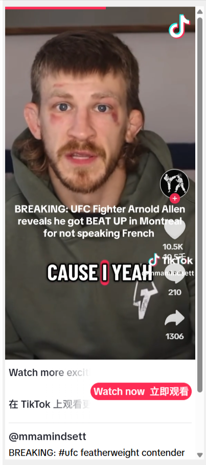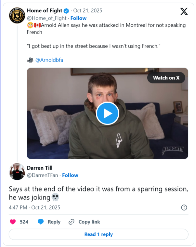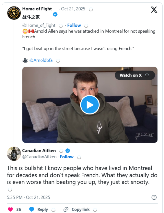 一位 UFC 明星声称,他因为“不会说法语”而在蒙特利尔“街头遭到殴打”。