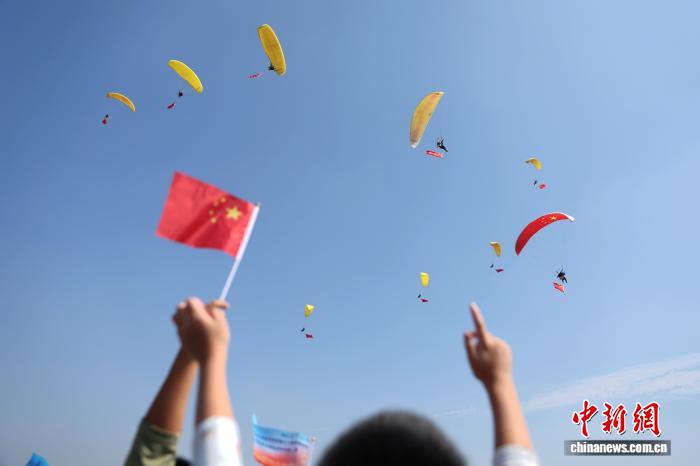 10月25日,2025年国际航联第16届特技定点跳伞世界杯暨第一届特技定点跳伞亚锦赛在江西省吉安市开幕。图为开幕式上动力伞表演。记者 刘占昆 摄