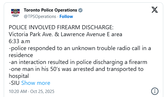 多伦多警方表示,他们于凌晨6点33分左右接到报警,称位于Victoria Park Avenue和Lawrence Avenue East附近发生“未知状况”。